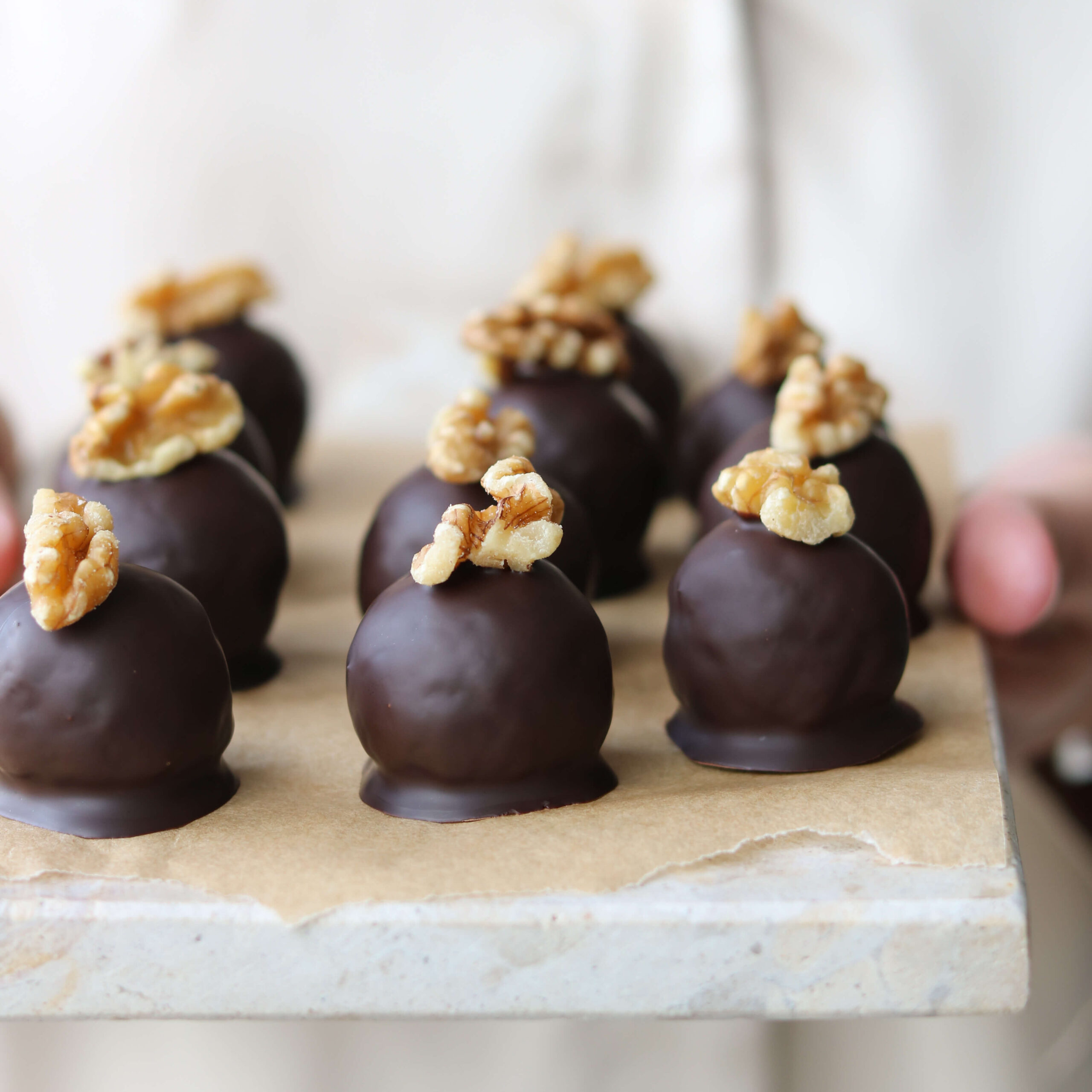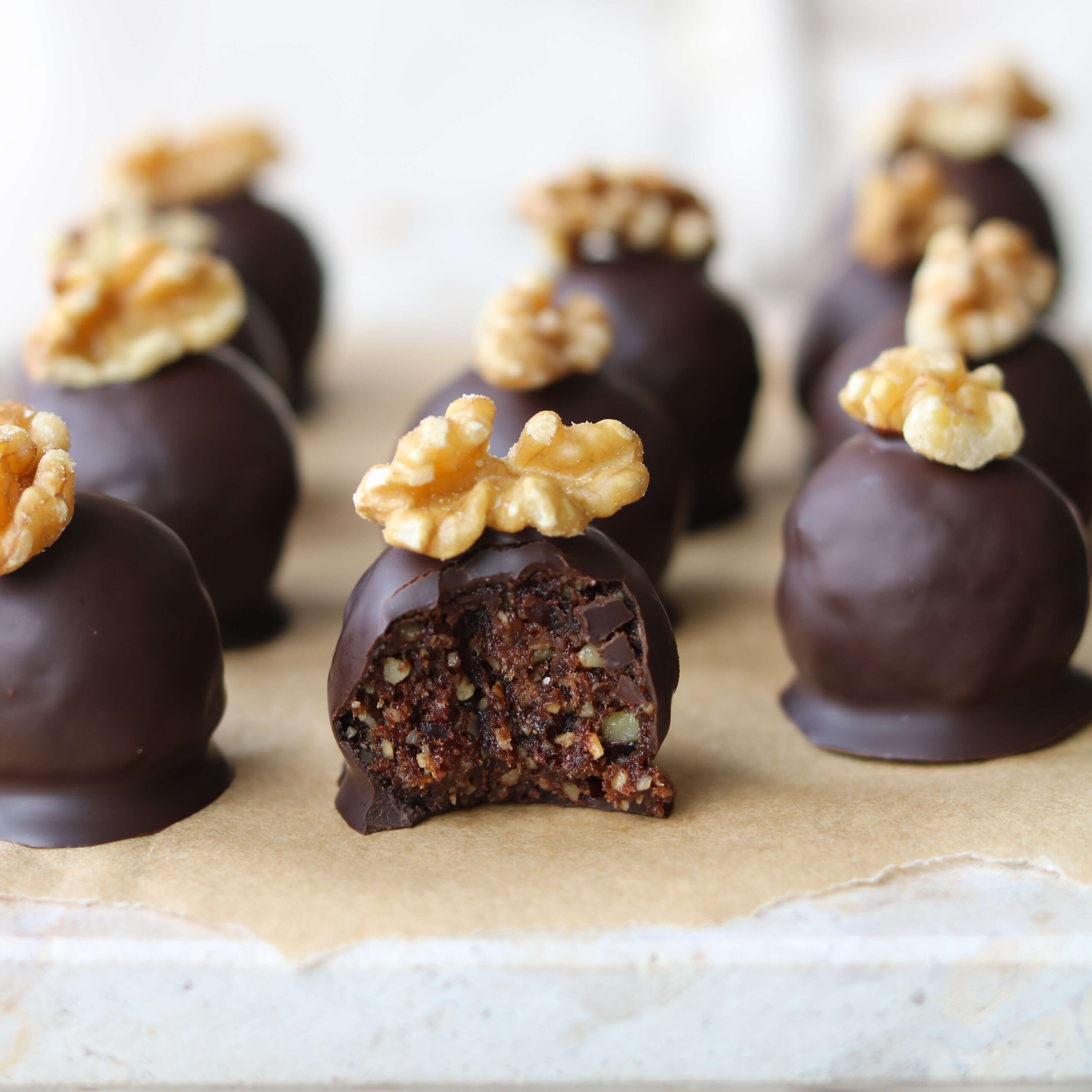 - Smelt chokoladen og vend hver kugle heri en af gangen. Top evt. med et lille stykke valnød (jeg plejer at knække dem lidt). Lad chokoladen størkne, gerne i køleskabet. Opbevar ligeledes kuglerne på køl efterfølgende og nyd en lækker mundfuld, når den søde tand melder sig 😋