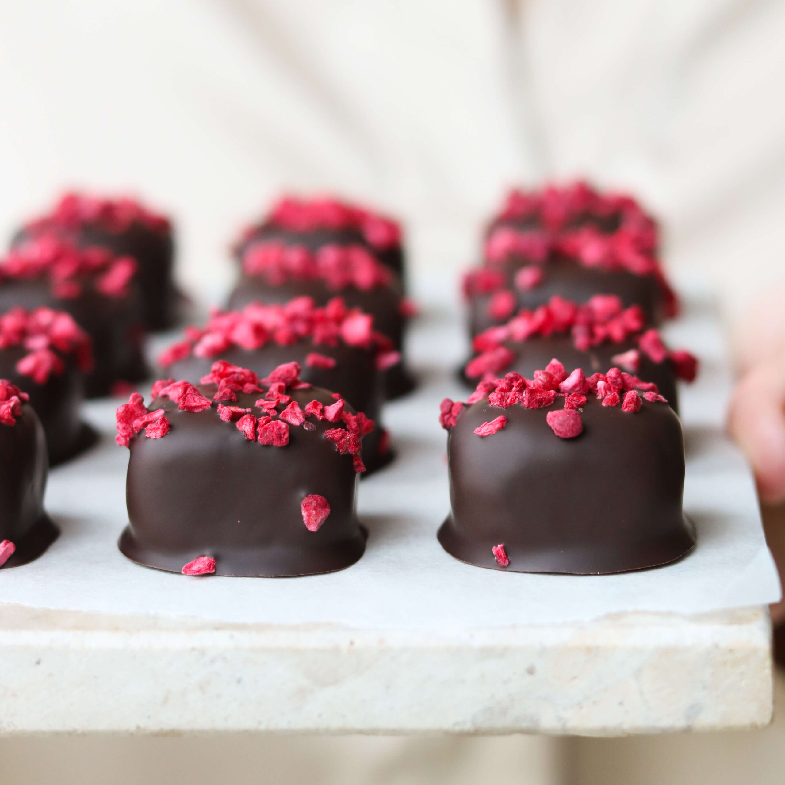 - Smelt den mørke chokolade og vend hver firkant én af gangen heri. Placer firkanterne på pladen med bagepapir og top evt. med lidt ekstra frysetørrede hindbær. Sæt konfekten i køleskabet og lad chokoladen størkne her.