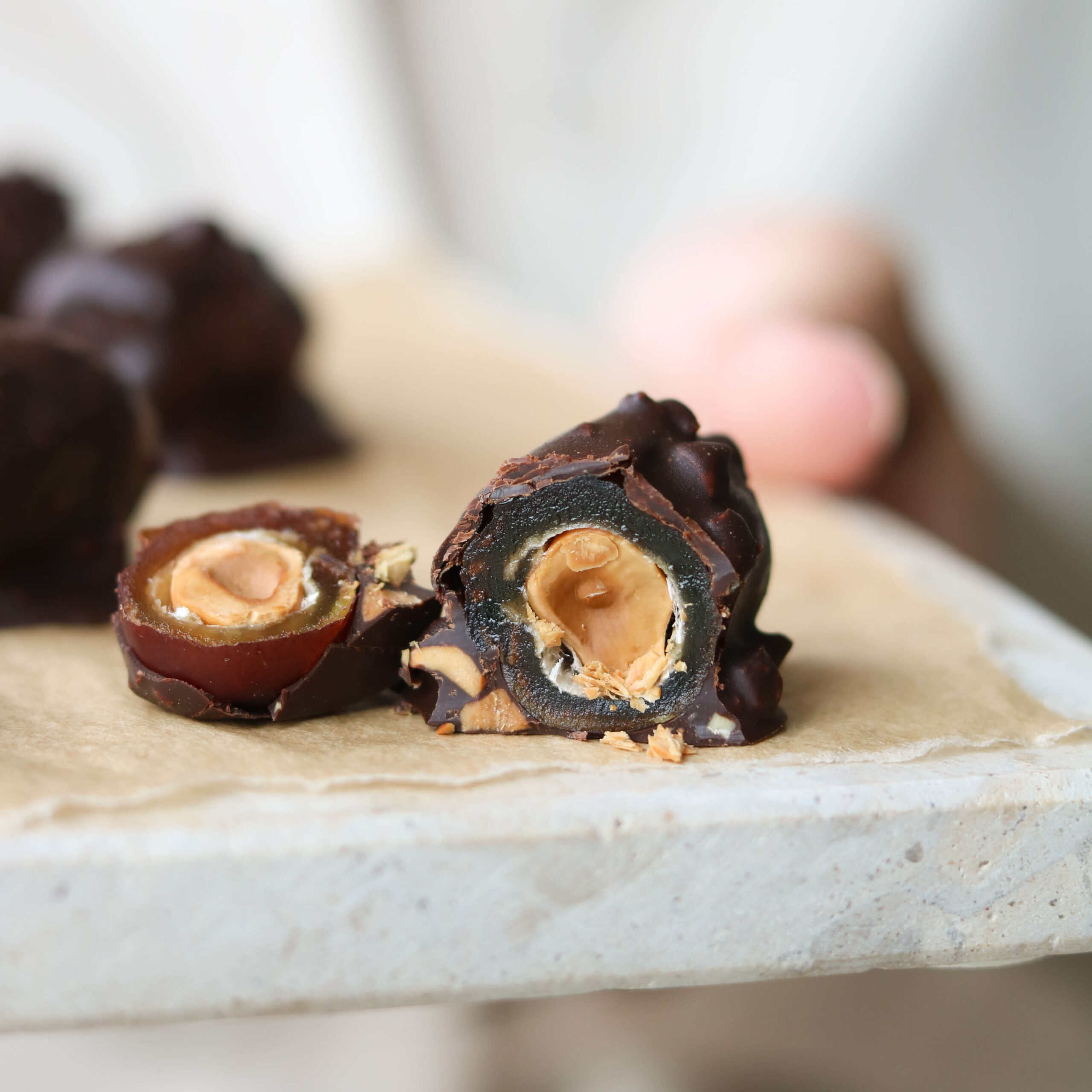 - Start med at riste hasselnødderne i ovnen på 200 grader i ca. 7-8 minutter. Hold gerne øje med dem, så de ikke brænder på. Lad dem herefter afkøle helt. Herefter kan skallen nemt nulres af. Der skal bruges ristede hasselnødder til at komme inden i dadlen, og resten skal hakkes helt fint og kommes i den smeltede chokolade til overtræk.