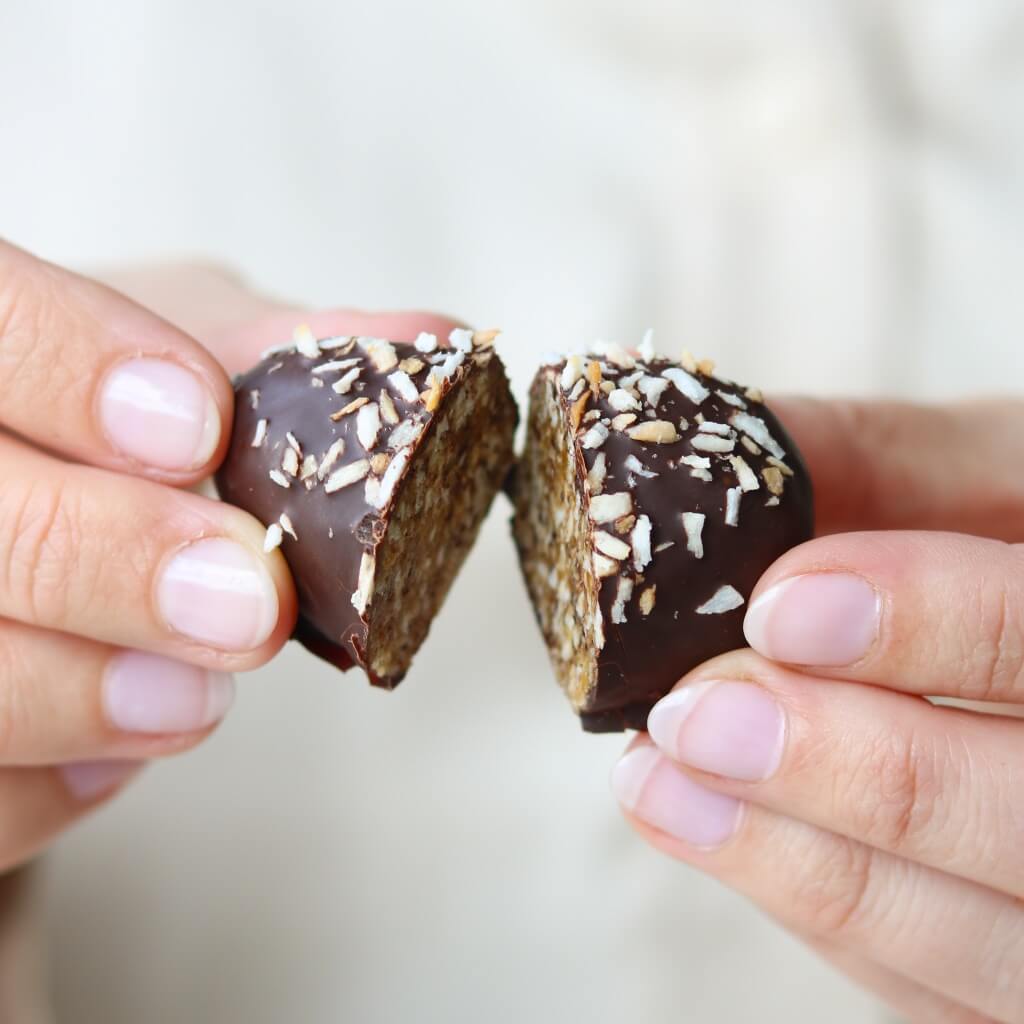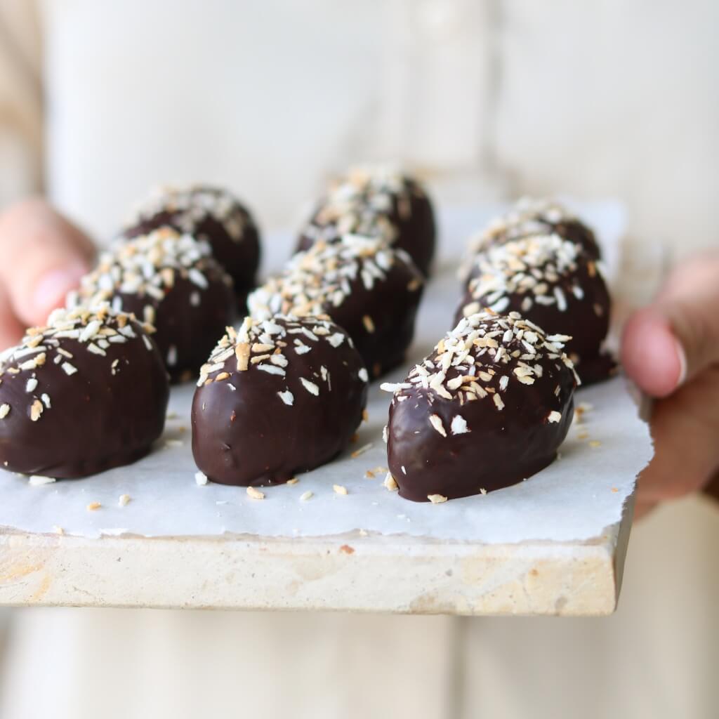- Smelt den mørke chokolade og vend æggene heri et af gangen. Placer dem igen på bagepapiret og top med lidt ekstra kokosmel. Lad chokoladen størkne, gerne i køleskabet. Opbevar ligeledes påskeæggene på køl herefter.
