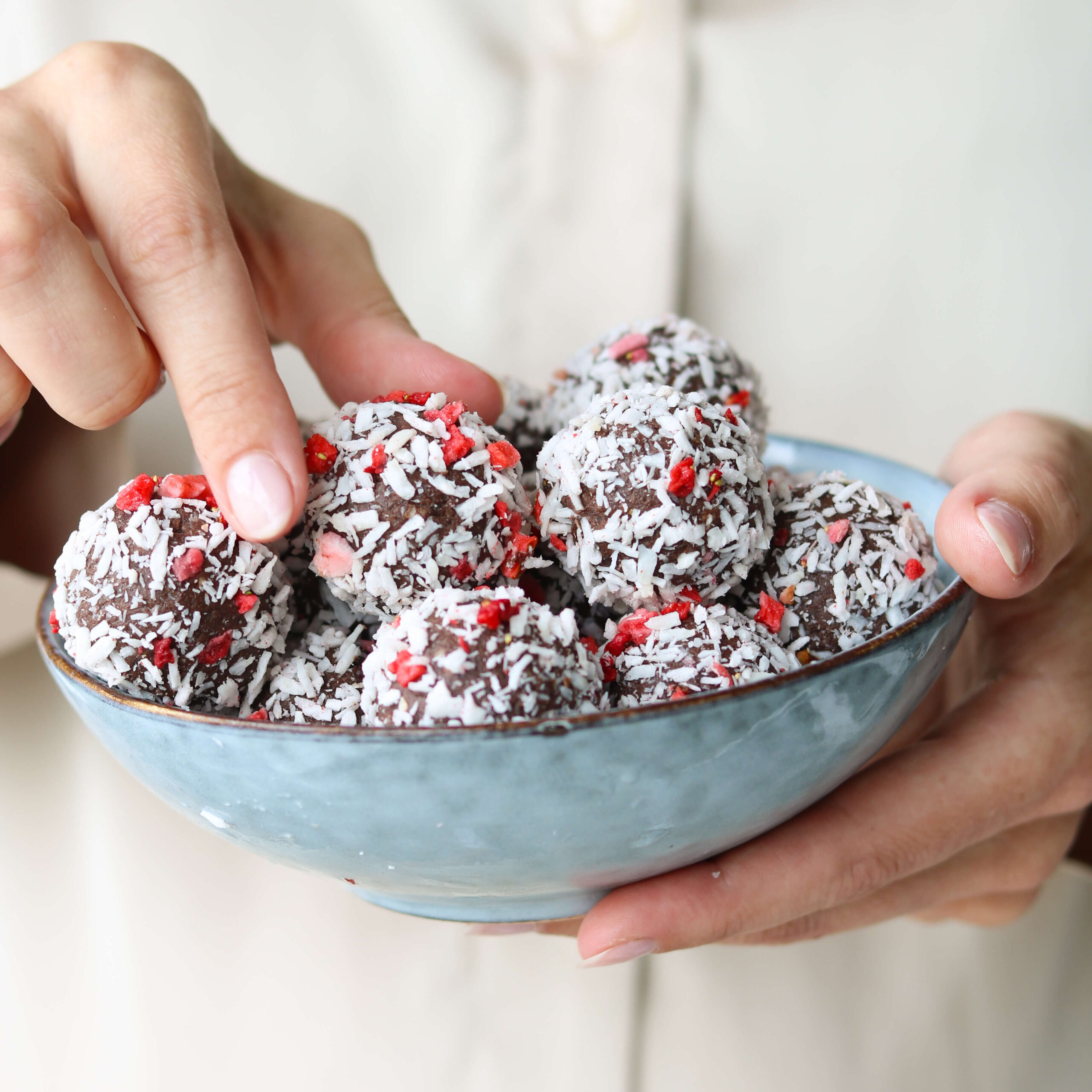 - Tag herefter en tsk. af dejen og rul den til en kugle. Vend den rundt i en skål med kokosmel. Gentag med den resterende del af dejen. Jeg fik i alt 25 stk.