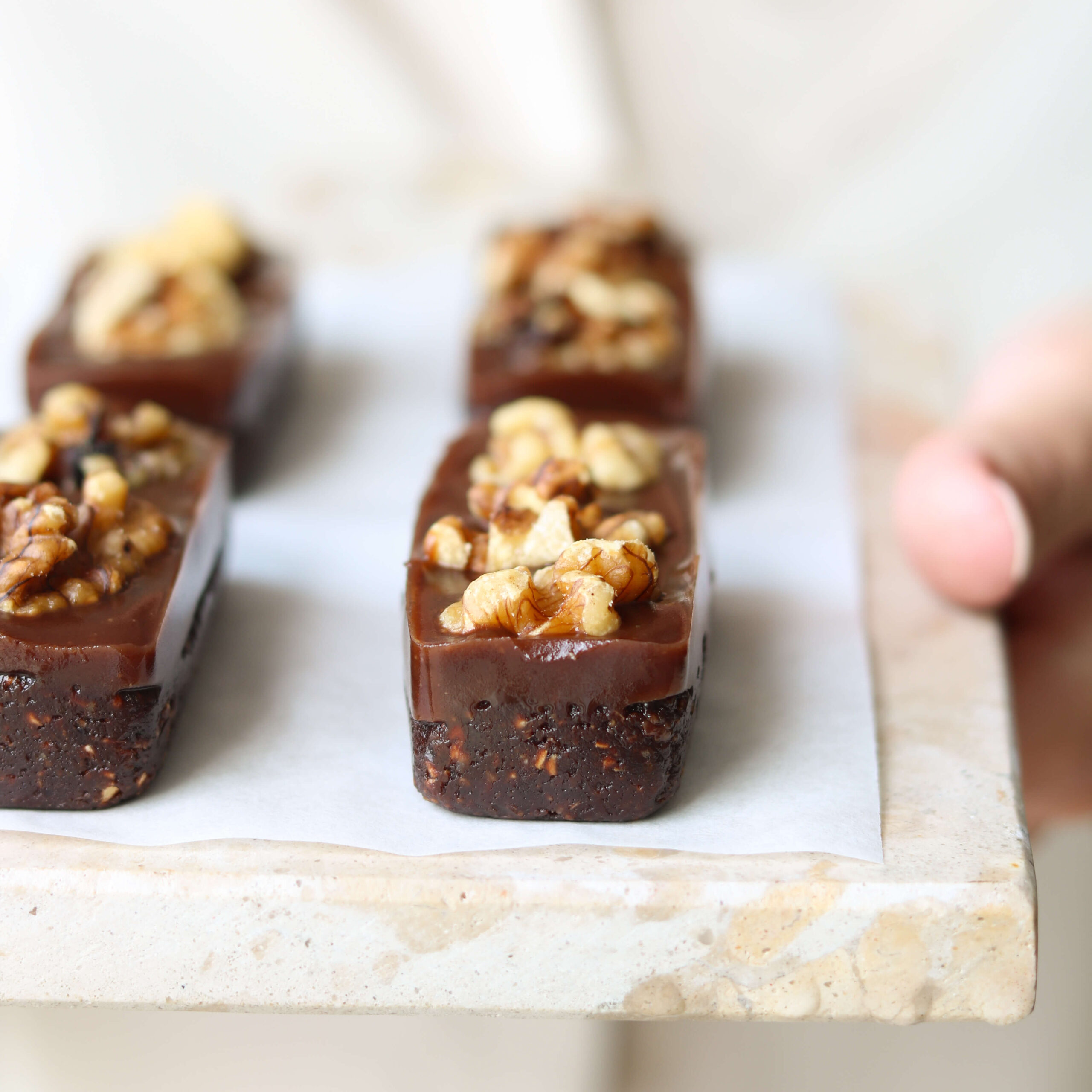 - Fordel den ligeligt og jævnt oven på bundene og top til sidst med valnødder.
