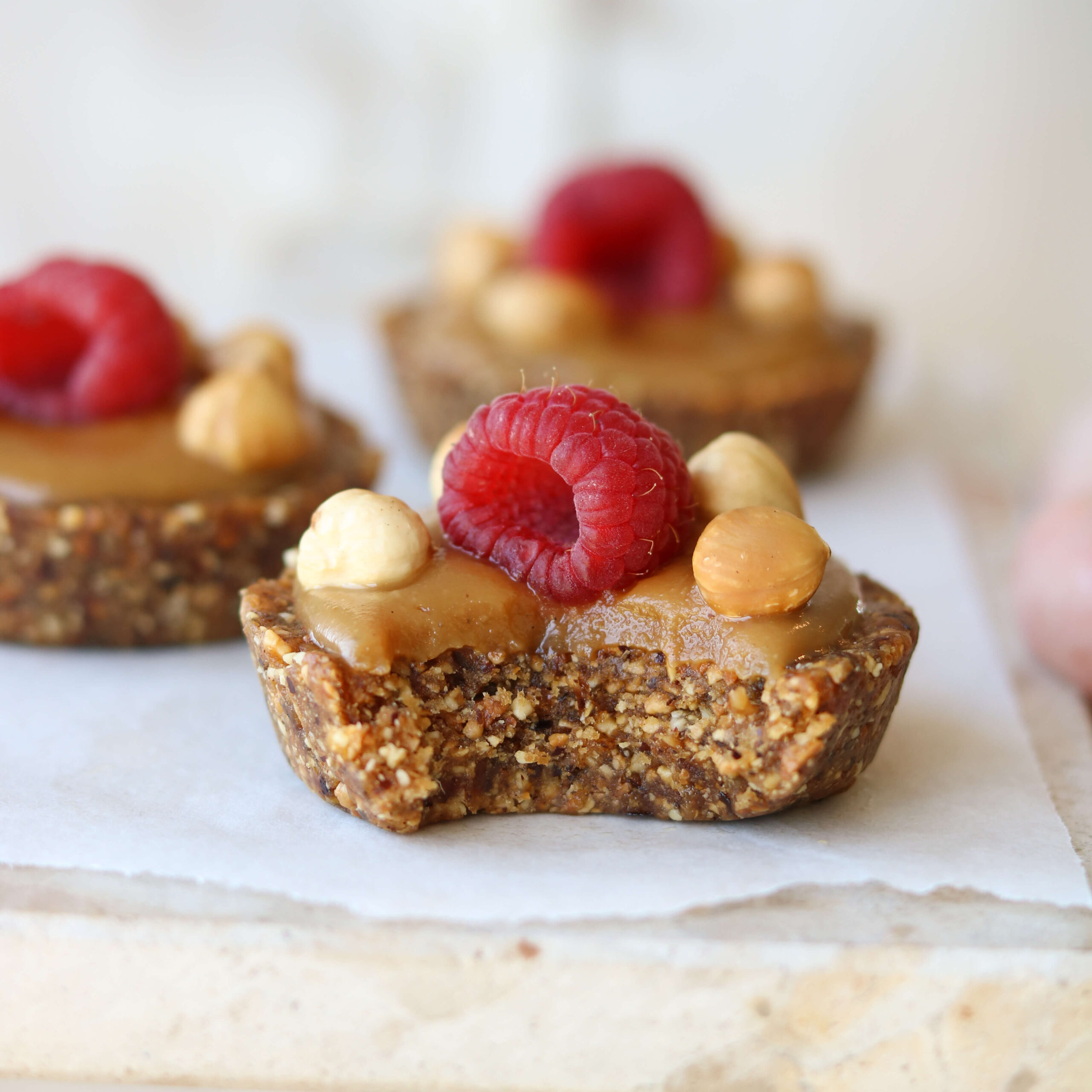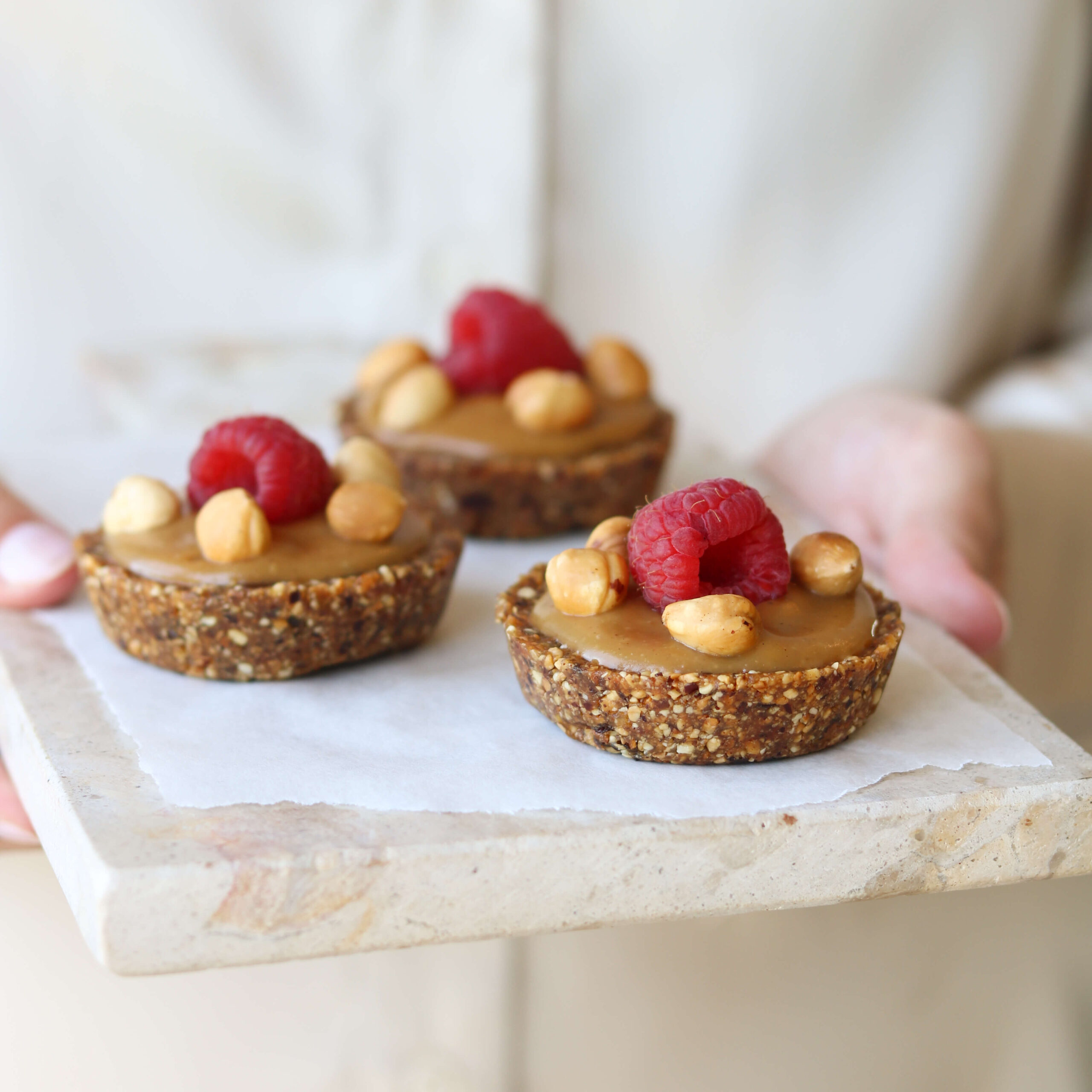 - Fordel karamellen oven på bundene. Top med friske hindbær og de ekstra ristede hasselnødder. Opbevar kagerne i en lufttæt beholder.